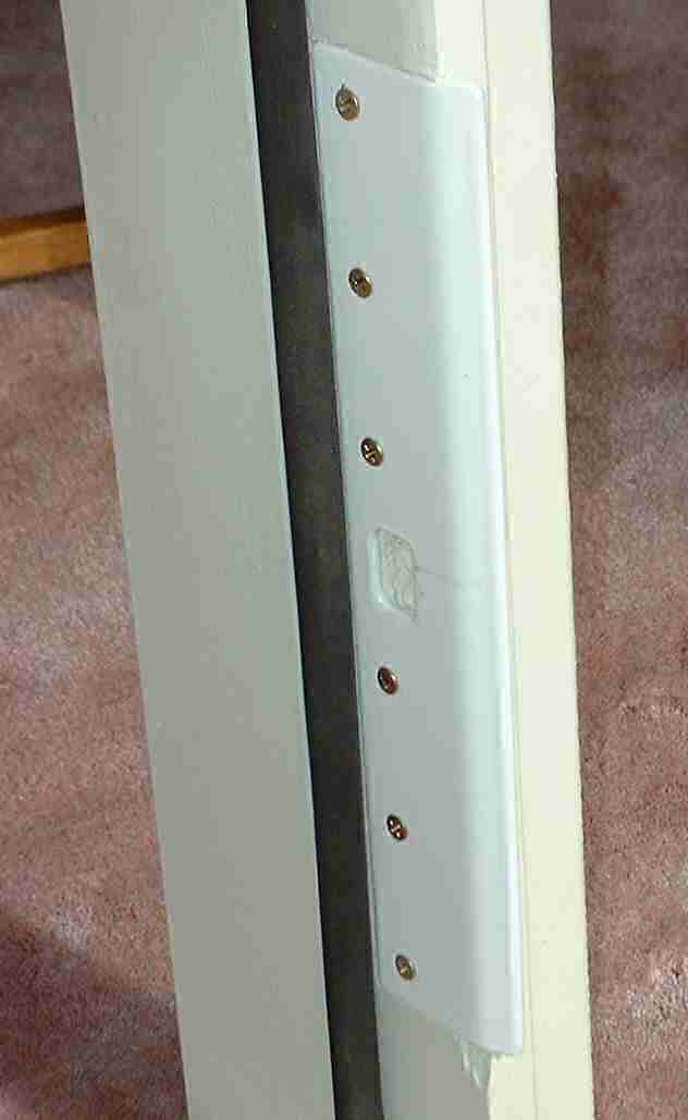 The Striker is a high-strength latch-plate which attaches not just to the sash, but to the 2x6 door framework with six 3-inch-long, high-strength screws, and prevents an intruder from forcing the door open and from splitting the door frame, either by impact or by wedging.